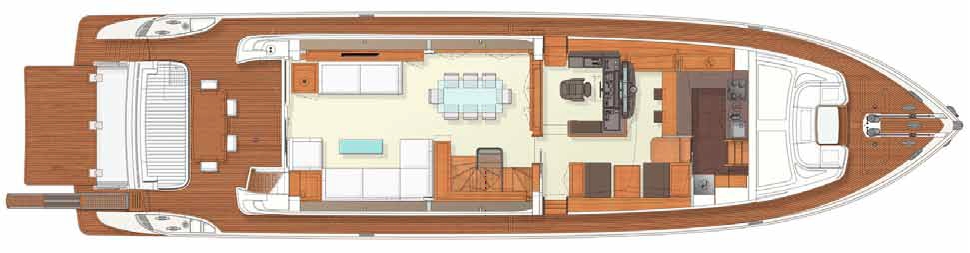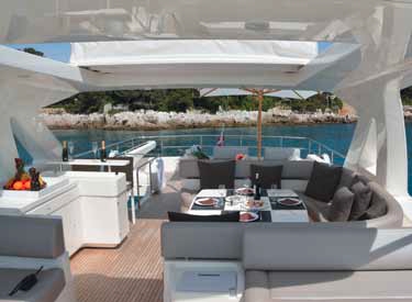 Between the galley is a bar counter where two or three people can sit on stools and chat with the chef, or have a snack. From the galley you can enter the two crew cabins at the bow. For night running the galley can be closed, as can be the dinette. At the fly bridge there is a large dining area with a U-shaped table, a grill area with fridge and a bar with 2 stools. In the back of the fly bridge, there is the big tender. There is also a large sundeck towards the stern.