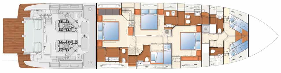 This four cabin motor yacht includes besides the spacious full beam master cabin, two VIP guest cabins and another guest cabin. Each cabin has its own en suite head. From the spacious salon with very large windows you have a fantastic view over the sea. The galley has been placed directly forward of the raised helm in a practical ‘U’-shape.